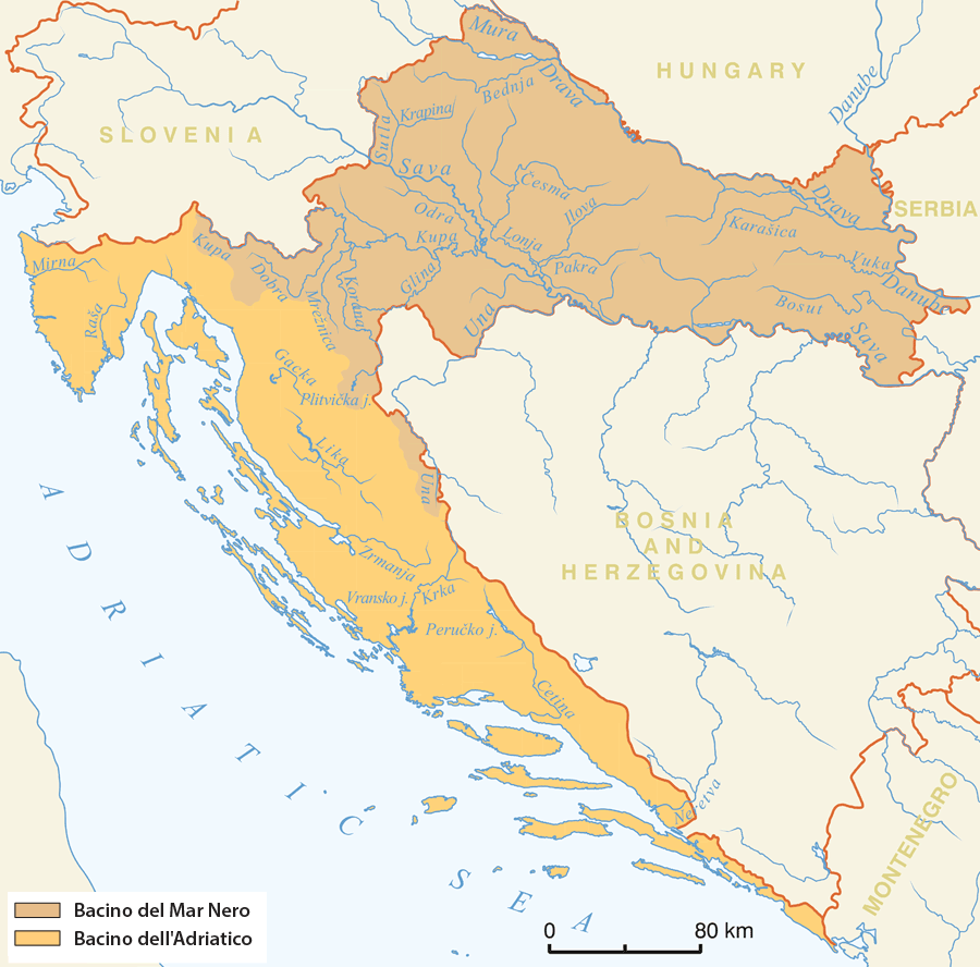 Circa il 62% del territorio in cui si ramifica la rete fluviale appartiene al bacino idrografico del Mar Nero. Anche i fiumi croati più lunghi, il Sava (562 km) e il Drava (505 km), che, come il Danubio nel quale sfociano, sono in gran parte fiumi di confine, appartengono al bacino idrografico del Mar Nero.