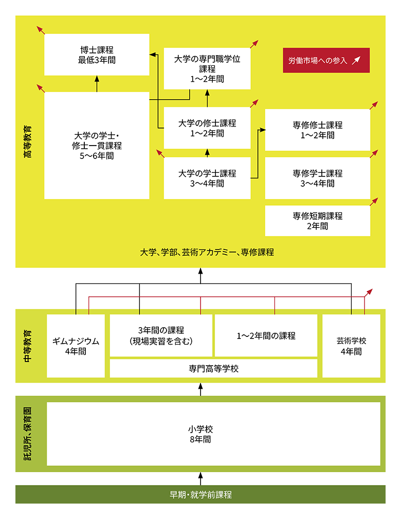 ボローニャ宣言の原則に従って、高等教育は、大学課程と専門職学位課程を通じて高等教育機関で行われている。高等教育機関は、大学、学部、芸術アカデミーと専門職大学に分けられる。