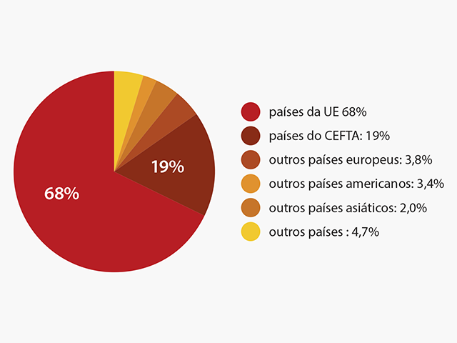 Os produtos mais exportados são os produtos alimentares, produtos metálicos acabados, equipamento elétrico, produtos minerais não metálicos, produtos e preparações farmacêuticas, madeira e produtos derivados de madeira, coque e derivados de petróleo refinado, máquinas e equipamentos, produtos de borracha e plástico, papel e produtos de papel, produtos químicos, metais, mobiliário, computadores e equipamento informático, veículos a motor e outros meios de transporte.