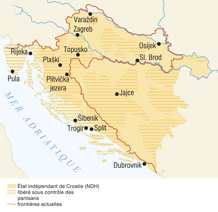 La résistance. Dès la fin 1942, la Croatie compte quelque 25 000 membres du mouvement de résistance; à l'automne 1943, ils sont 100 000 et, à la fin de 1944, plus de 150 000. Parmi les 26 divisions commandées par l'état-major des partisans en 1943, 11 sont croates, 7 sont composées de combattants originaires de Bosnie-Herzégovine, 5 sont slovènes, 2 serbes et 1 monténégrine. La Croatie est l'un des rares pays d'Europe à s'être libéré par ses propres forces au cours de la Seconde Guerre mondiale, sans l'aide active dans les combats des Alliés par des forces terrestres. Le préambule de l'actuelle Constitution de la République de Croatie rappelle que ce pays se situe dans la continuité de la Croatie libre qui vit le jour dans la résistance aux forces de l'Axe.